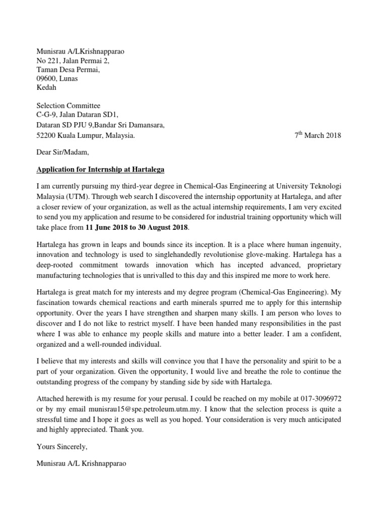 View a real cover letter for the petronas internship position human resource. 2931 Jalan Lawan Pedang 1327 Seksyen 13 40100 Shah. Here are 3 types of sample cover letters that will help your applications stand out.